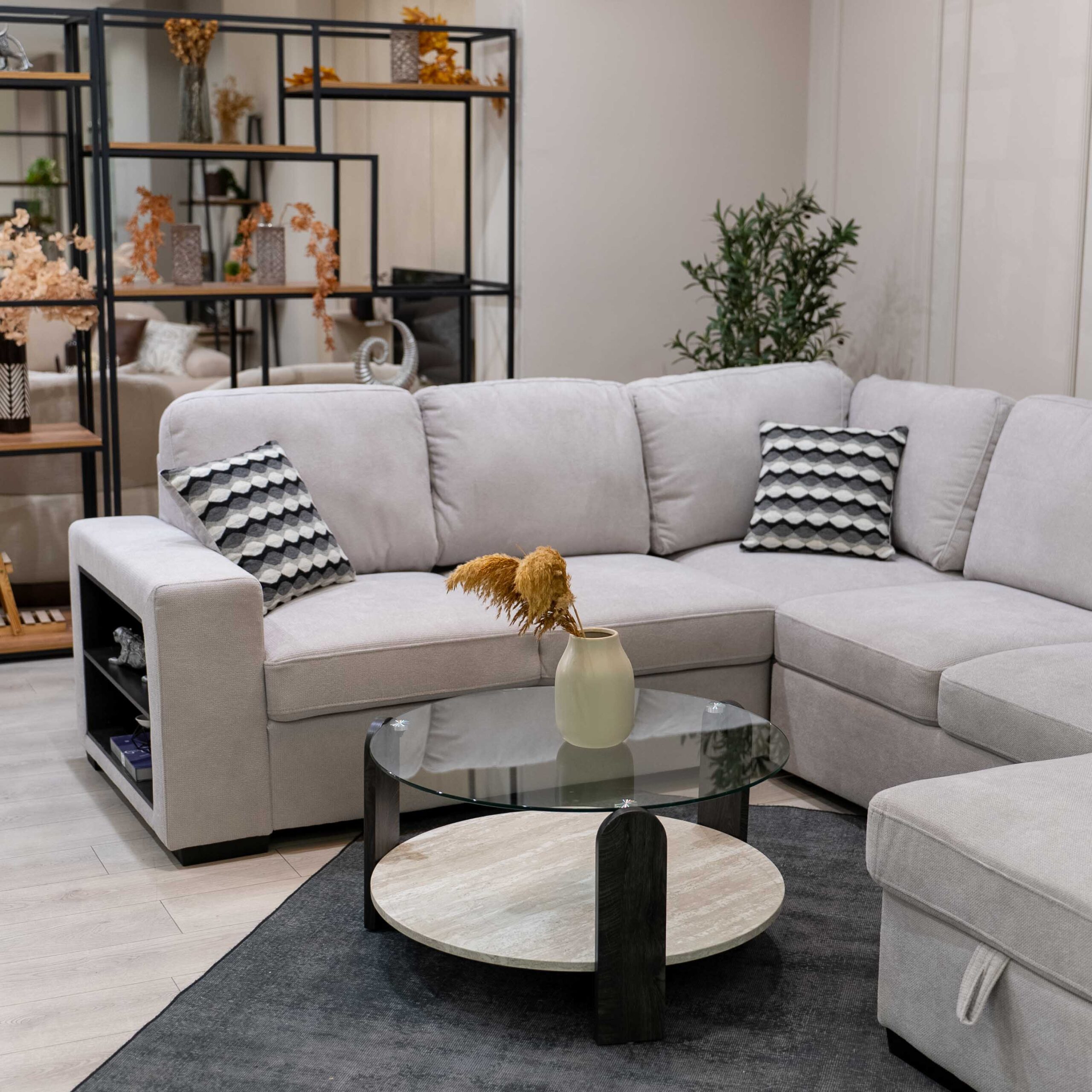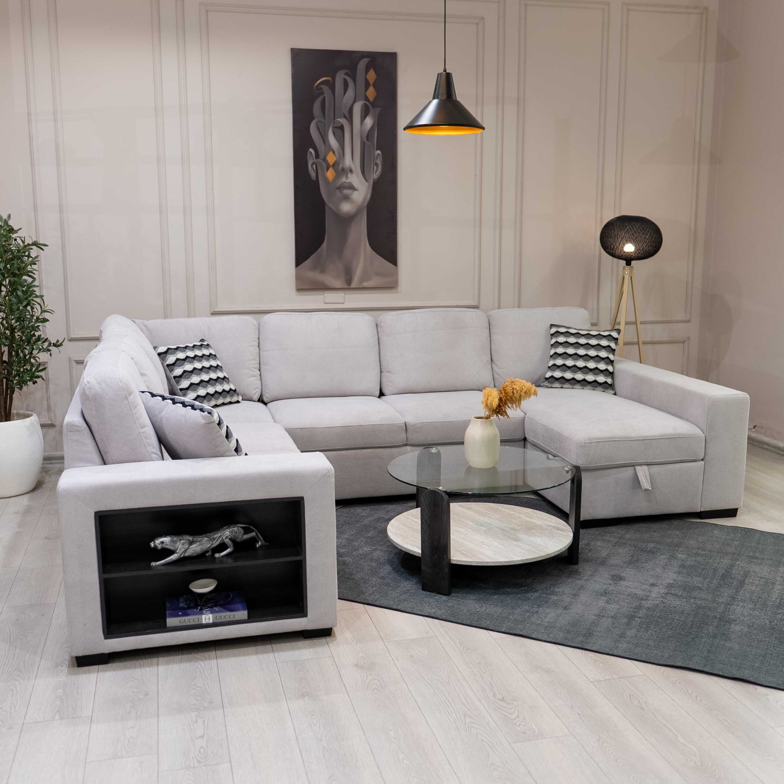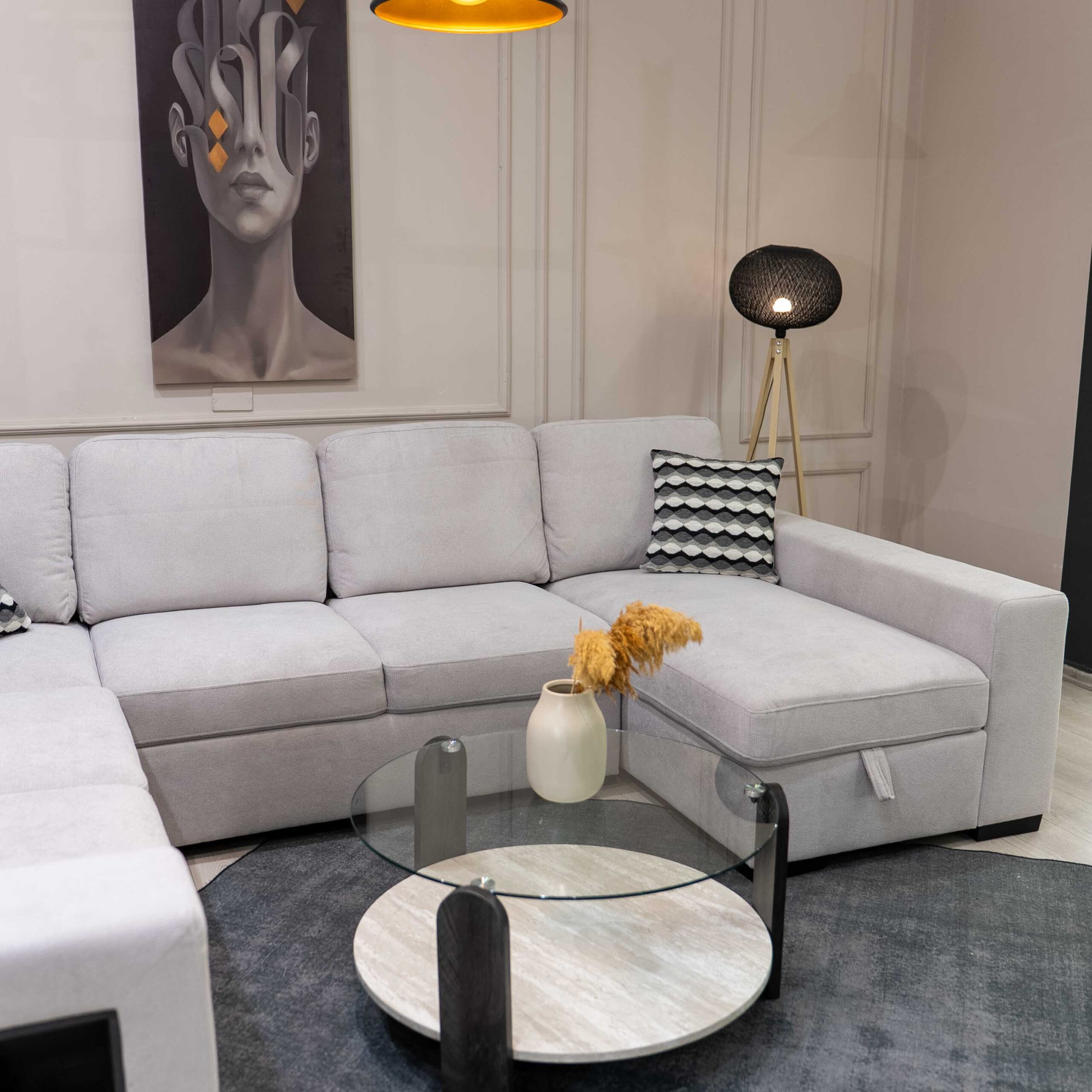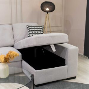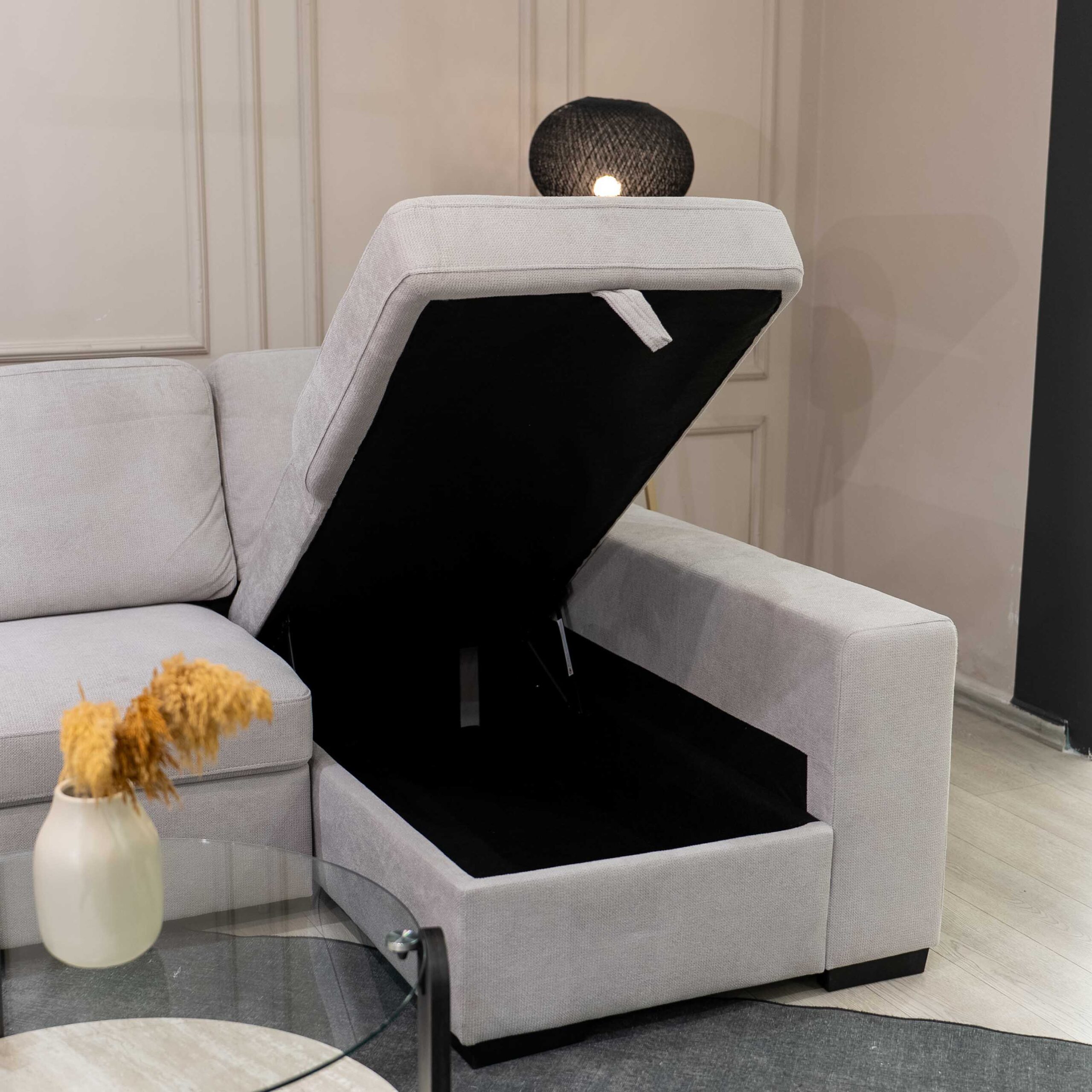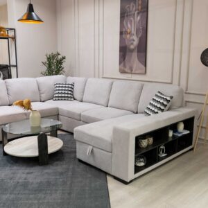 زاوية كنب مودرن بلون بيج فاتح، تجمع بين الأناقة والوظائف الذكية لتناسب المساحات الواسعة بأسلوب عصري.