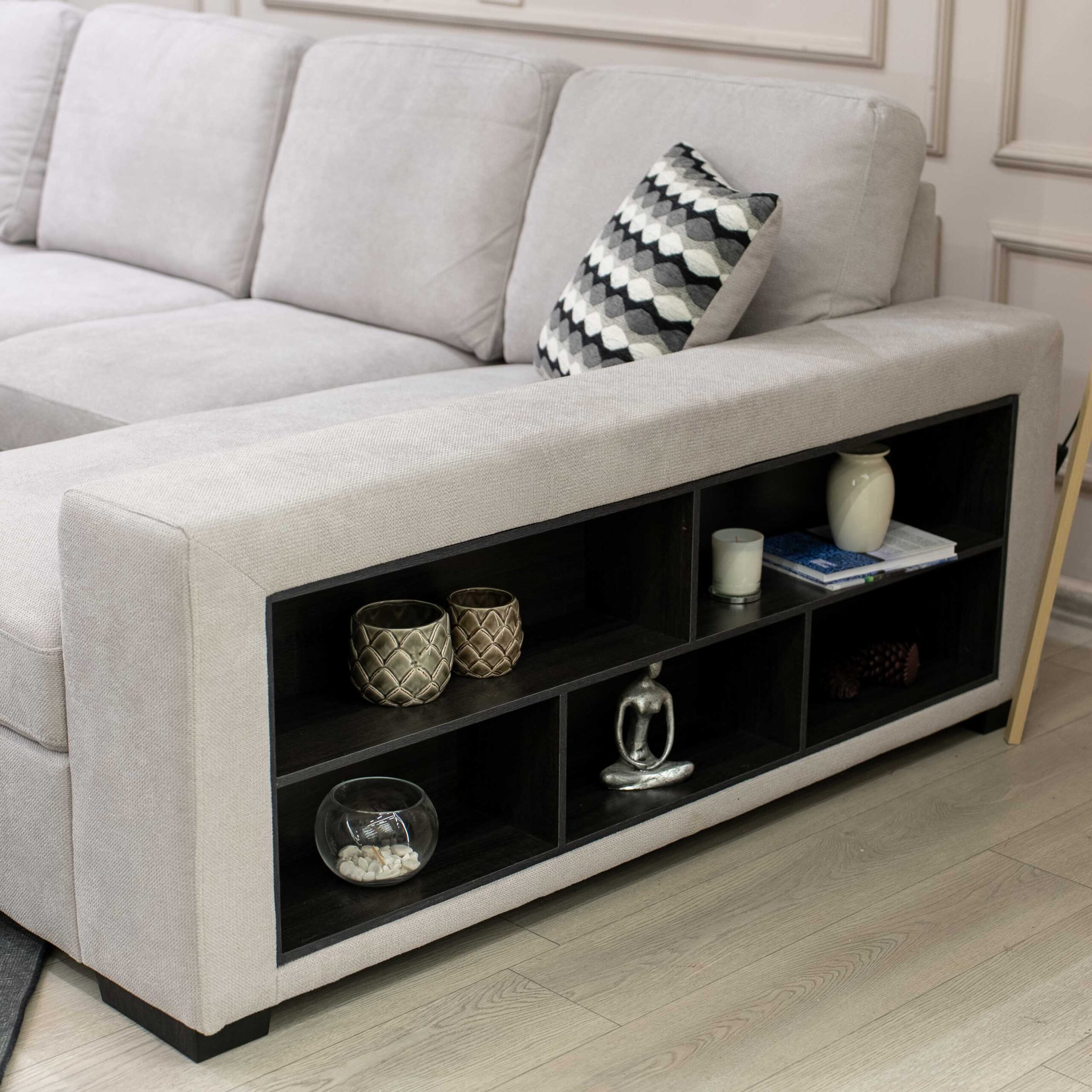 تتميز بذراعين جانبيين مزودين بأرفف خشبية سوداء مدمجة، تضيف لمسة ديكور عملية