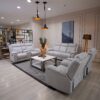 مقاعد قابلة للتمدد لراحة كاملة مساند ظهر ورقبة مبطنة لدعم مثالي تصميم عصري فاخر بلون رمادي أنيق جلسات واسعة ومريحة للعائلة والضيوف مناسب لجلسات الأسترخاء اليومية