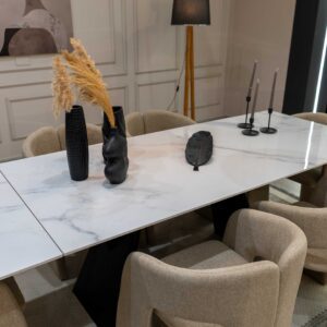 طاولة سفرة بتصميم عصري أنيق تجمع بين الفخامة والعملية. تتميز بسطح رخامي لامع يمنح لمسة فاخرة، مع كراسي مبطنة مريحة تضيف دفء وأناقة للمكان