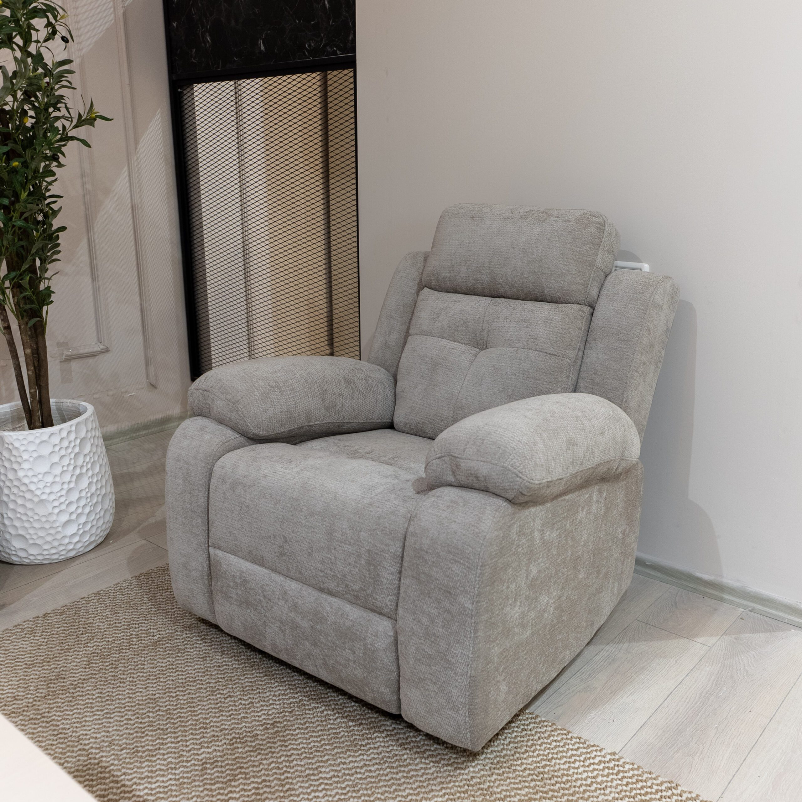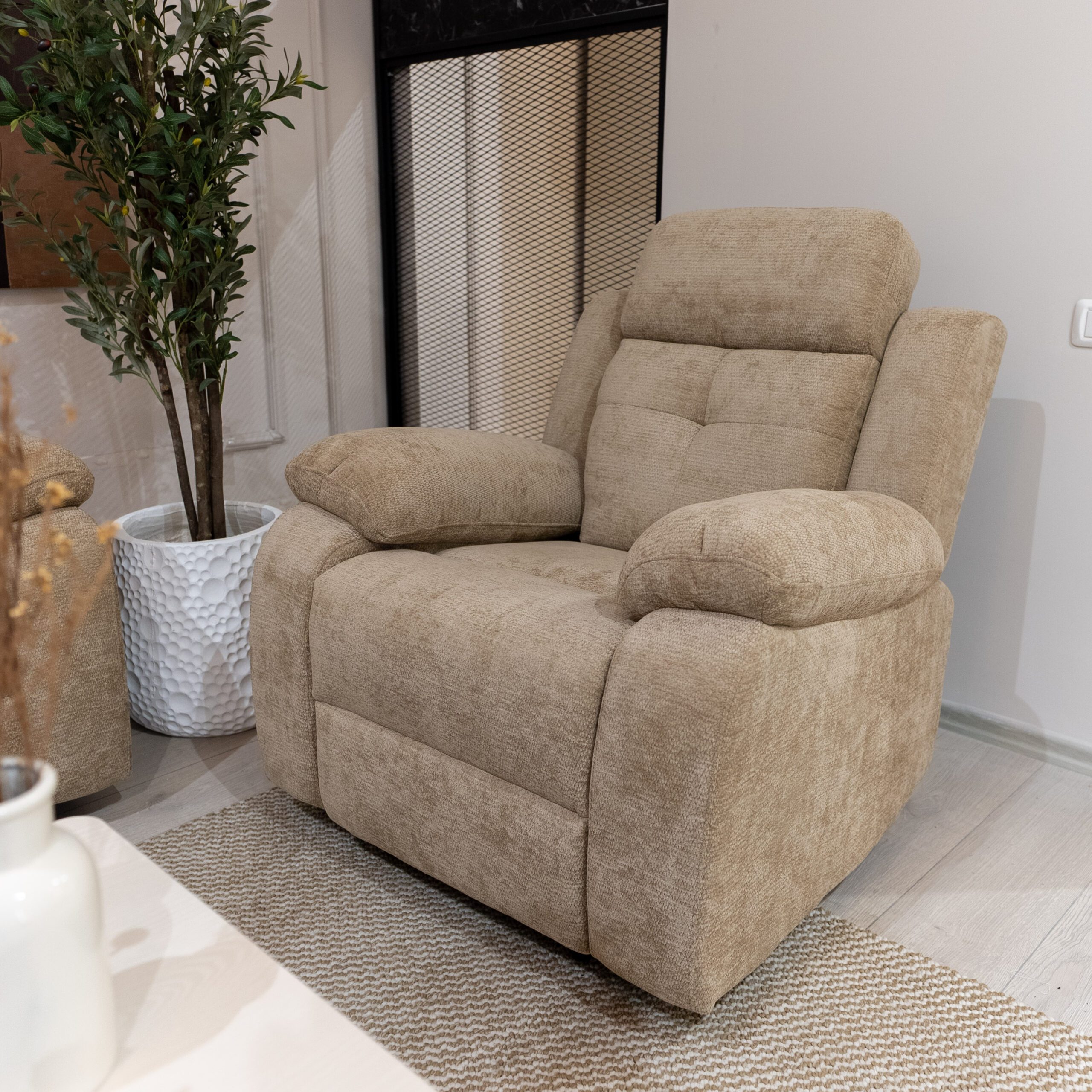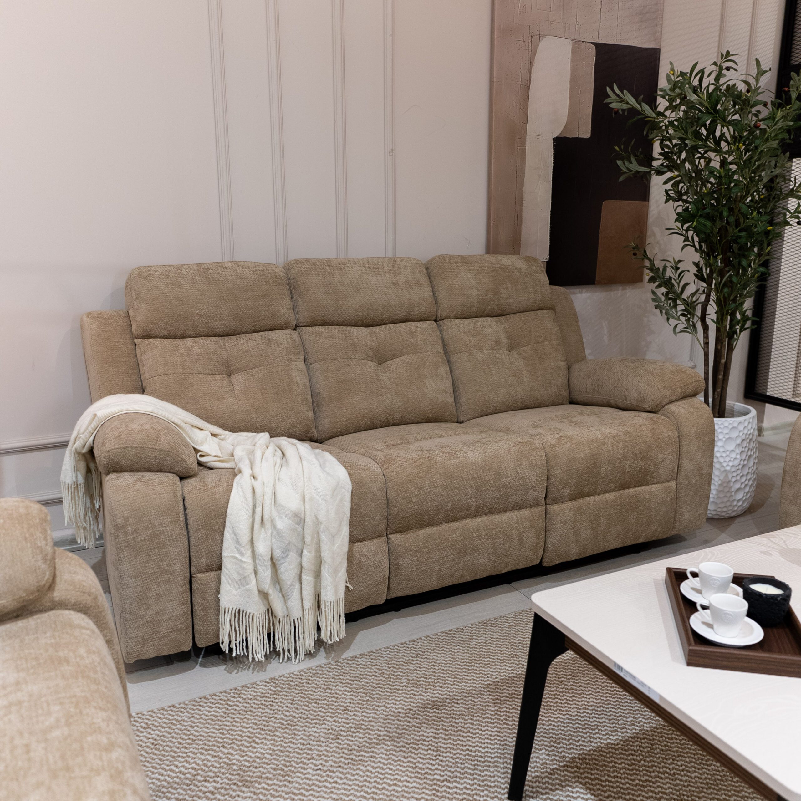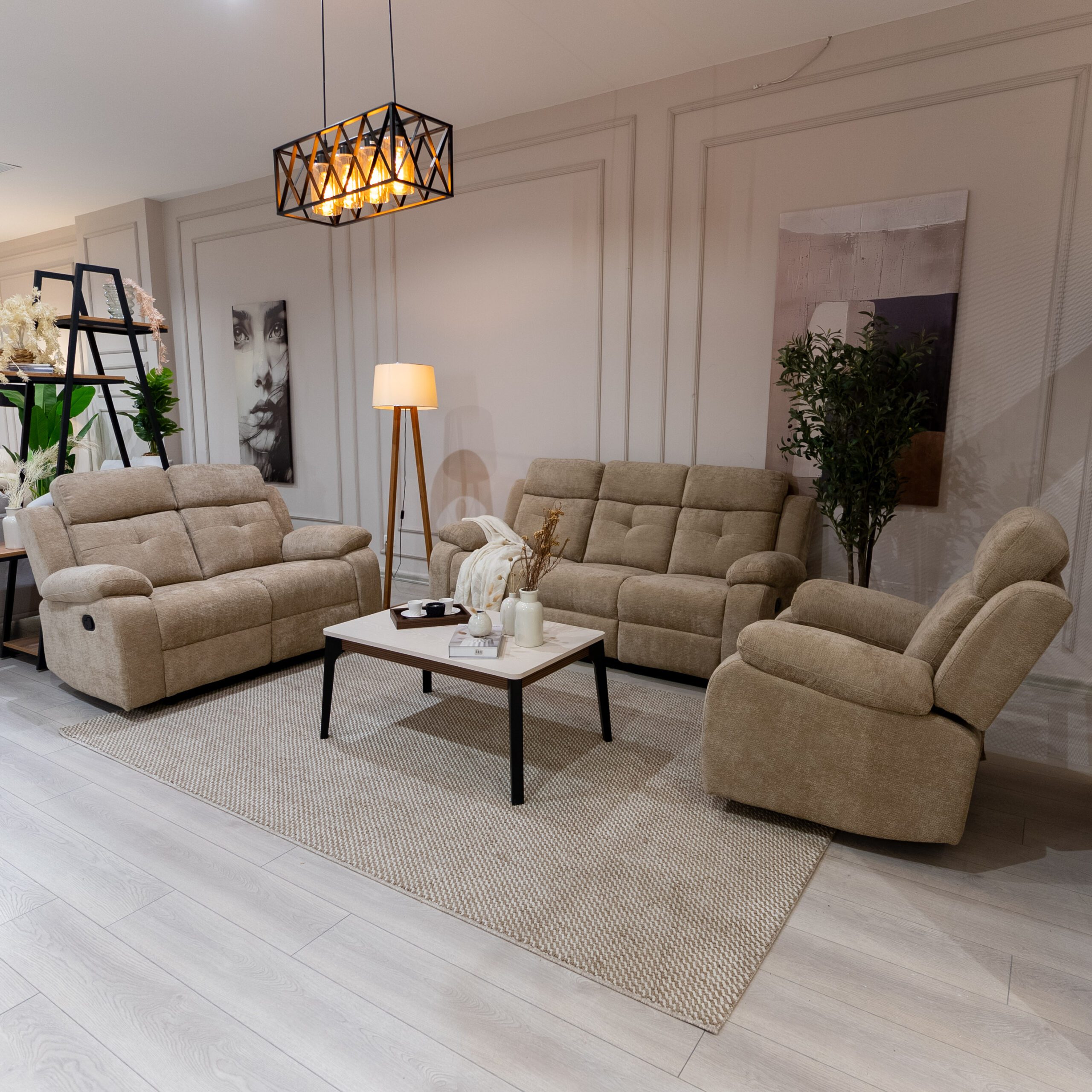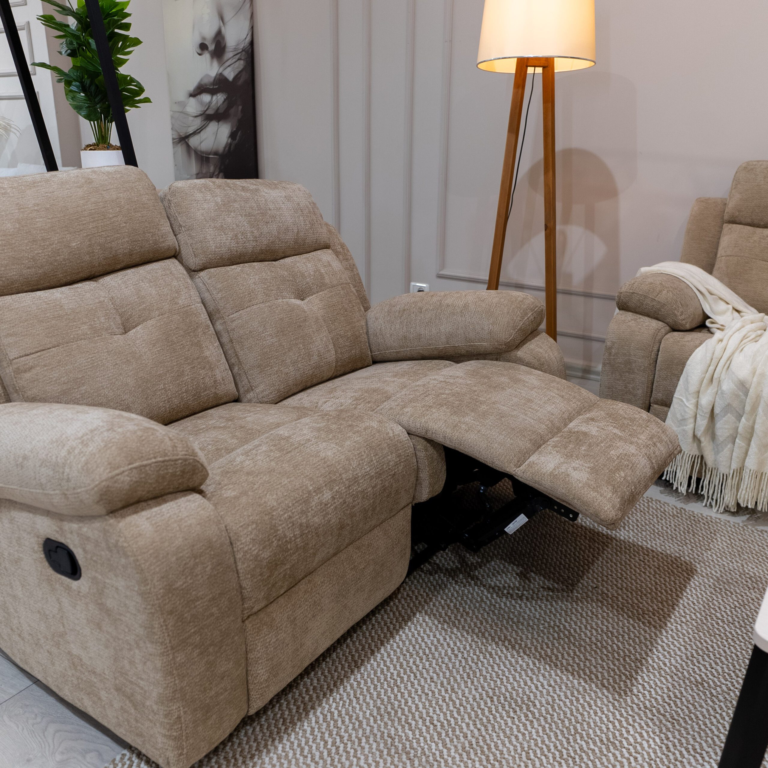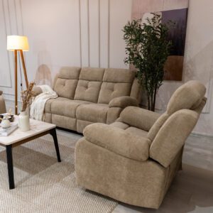 طقم ريكلاينر بتصميم عملي مريح ليمنحك أقصى درجات الإسترخاء,متوفر بلونين البيج والسكني ممزين لتختار الأنسب لذوقك