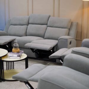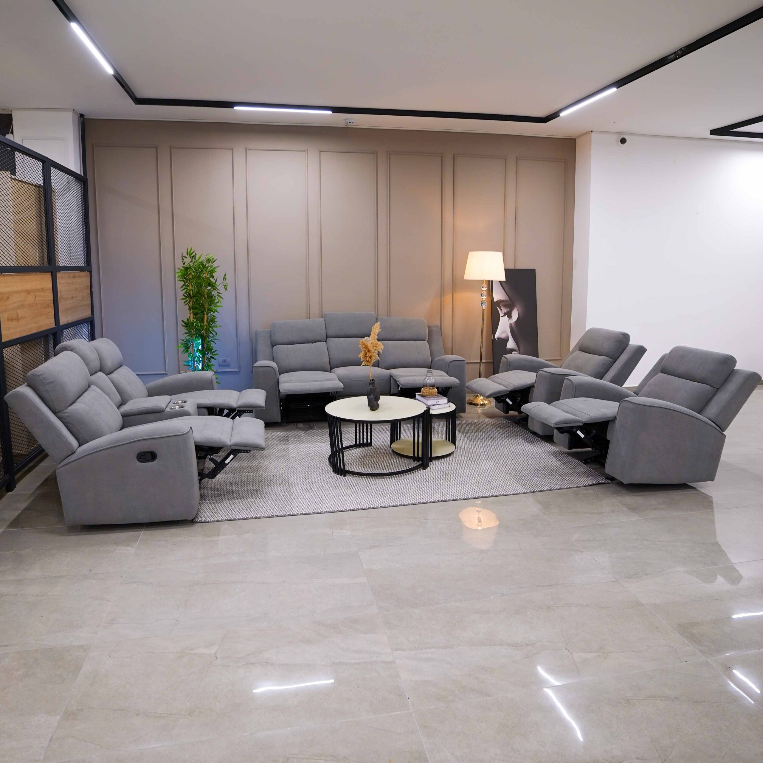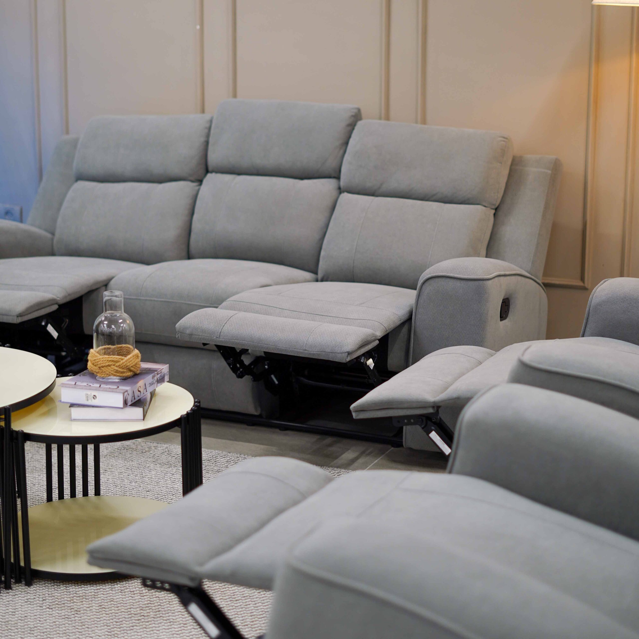 كنب ريكلاينر بتصميم عصري مصمم خصيصًا للراحة والاسترخاء, يتميز بمقاعد مع مساند قدم مدمجة تمنحك إحساسًا مثاليًا بعد يوم طويل