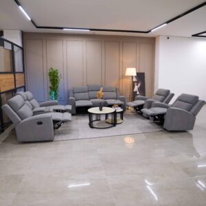 مقاعد قابلة للتمدد لراحة كاملة مساند ظهر ورقبة مبطنة لدعم مثالي تصميم عصري فاخر بلون رمادي أنيق جلسات واسعة ومريحة للعائلة والضيوف مناسب لجلسات الأسترخاء اليومية
