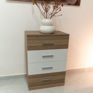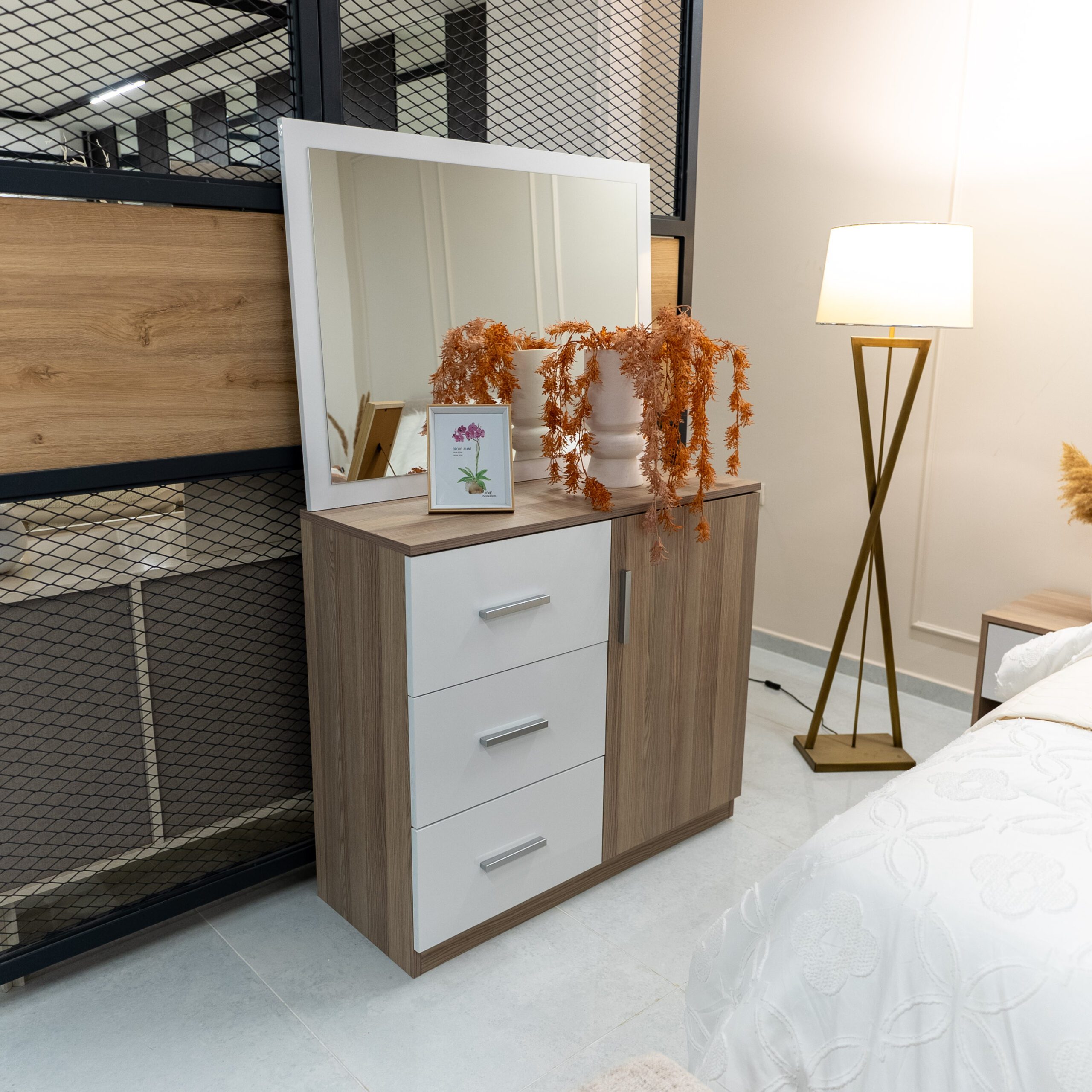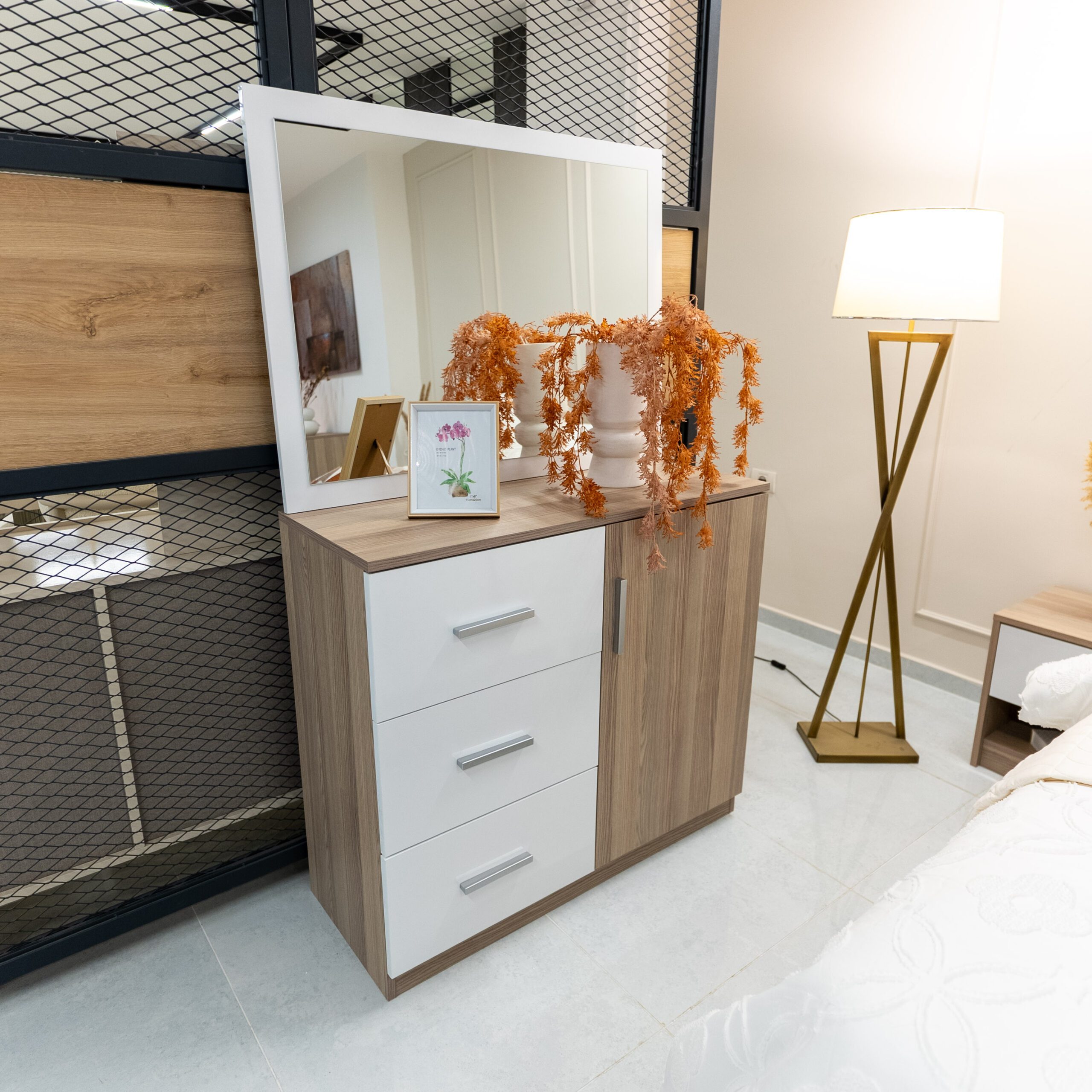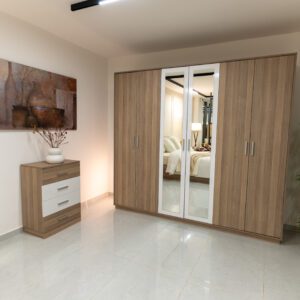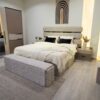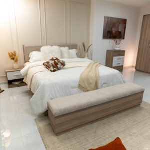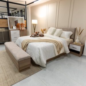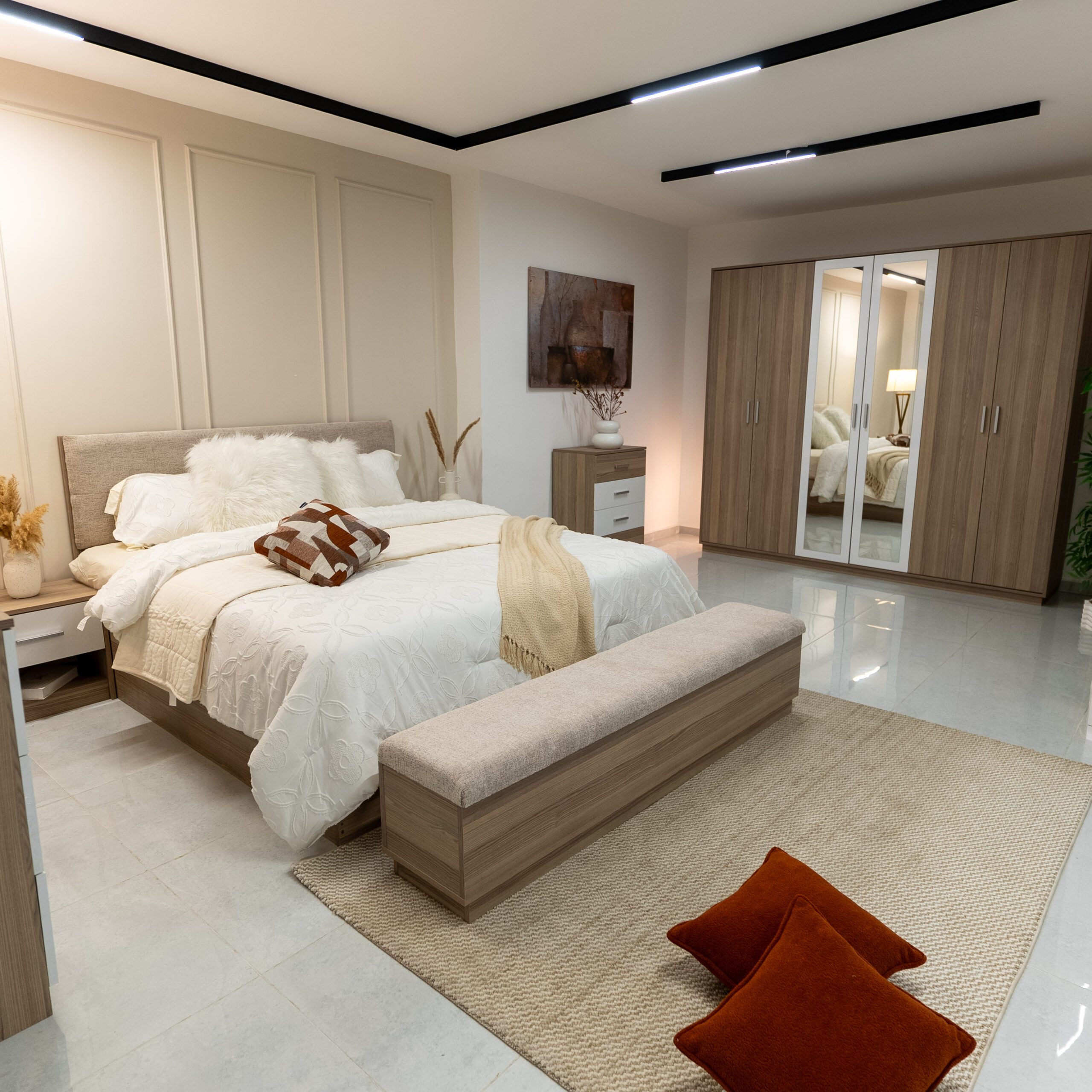 غرفة نوم بتصميم عصري وألوان هادئة الغرفة تشمل: سرير مع صندوق تخزين ومقعد أمامي، كومدينا عدد 2، تواليت، خزانة 6 دفات، وحدة جوارير.